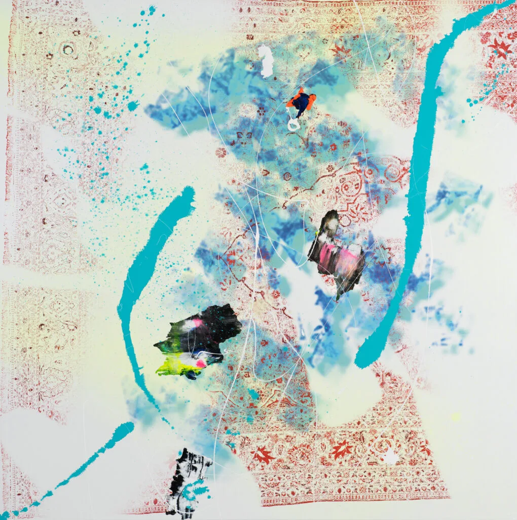 Holger Schmidhuber: MOVE – ANGELS TOUCHED MY SOUL (Carpets of the Forgotten), 2023, Mischtechnik auf Orientteppich, 351 x 506 cm
